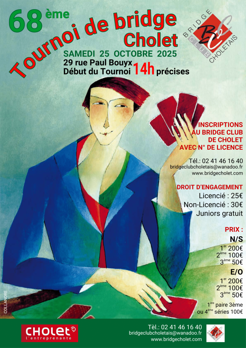 Le Bridge Club Choletais organise le tournoi de Cholet le 25 octobre 2025.
